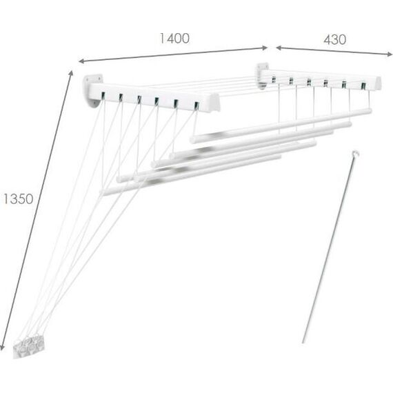 ЦВЕТ: белый. РАЗМЕР ИЗДЕЛИЯ: 430 x 1 400 x 1 350 мм. МАТЕРИАЛ: металл + полипропилен. Сушилка для белья с возможностью крепления на стену или к потолку. Оптимальна для использования в ванной комнате или на балконе. Изготовлена из нержавеющей стали с полимерным порошковым покрытием, которое защищает от воздействия влаги и предотвращает механические повреждения. Суммарная длина поверхности для размещения белья - 8,4м. Максимальная нагрузка - 12кг.