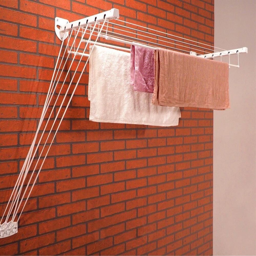ЦВЕТ: белый. РАЗМЕР ИЗДЕЛИЯ: 430 x 1 600 x 1 350 мм. МАТЕРИАЛ: металл + полипропилен. Представляет из себя конструкцию из крепежных кронштейнов, штанг-трубок, на которых развешивается бельё, и веревочной системы для фиксирования штанг на двух разных положениях: на высоте комфортной для развешивания белья и на высоте для сушки белья. Суммарная длина поверхности для размещения белья - 9,6м. Максимальная нагрузка - 12кг.