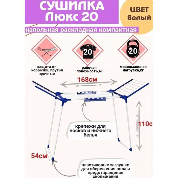 ЦВЕТ: белый. РАЗМЕР ИЗДЕЛИЯ: 535 x 1 680 x 1 100 мм. МАТЕРИАЛ: металл + полипропилен. Напольная сушилка «Люкс» - металлическая складная конструкция для размещения мокрого белья на горизонтальной поверхности. Оснащена двумя откидными створками и пластиковыми накладками с креплениями для сушки нижнего белья, носков, платков. Сушильное полотно имеет длину 20м и выдерживает нагрузку в 20кг. Ножки сушилки оснащены пластиковыми накладками для предотвращения скольжения сушилки по поверхности пола.