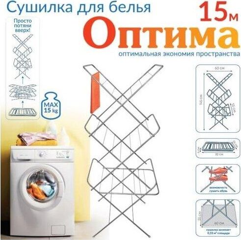 Тип товара: сушилка для белья Серия: Оптима Длина: 145 см Ширина: 55 см Высота: 60 см Максимальная нагрузка: 20 кг Размещение: напольная Материал корпуса: металл Конструкция: складная Рабочая длина: 15 м Цвет: серый Прутья: металлические