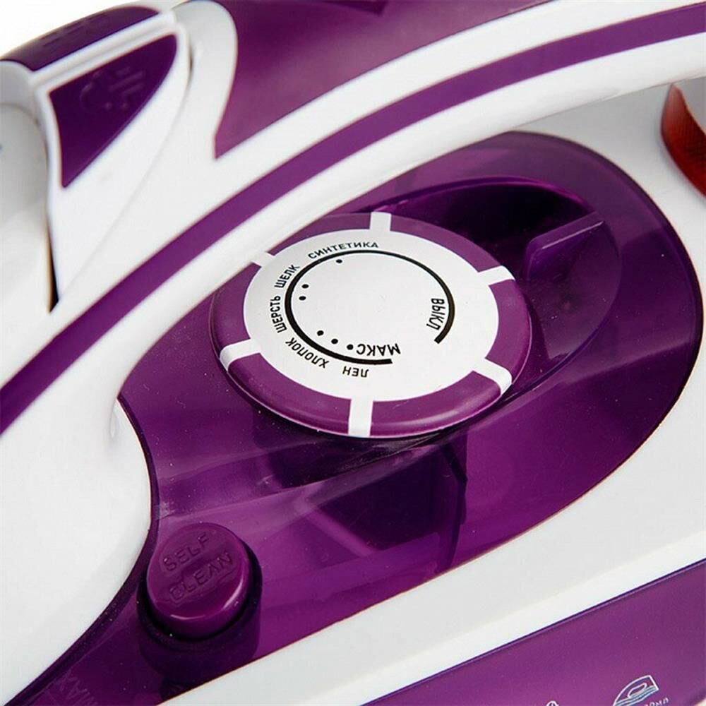 Максимальная мощность 2200 Вт. Керамическая подошва. Прозрачный резервуар для воды. Индикатор нагрева утюга. Терморегулятор. Три рабочих режима: сухое глажение, отпаривание, разбрызгивание воды. Возможность регулировки степени отпаривания. Возможность вертикального отпаривания. Функция "Паровой удар". Функция "Самоочистка". Функция "Защита от накипи". Цвет: фиолетовый. Специальный стаканчик для заполнения резервуара водой.
