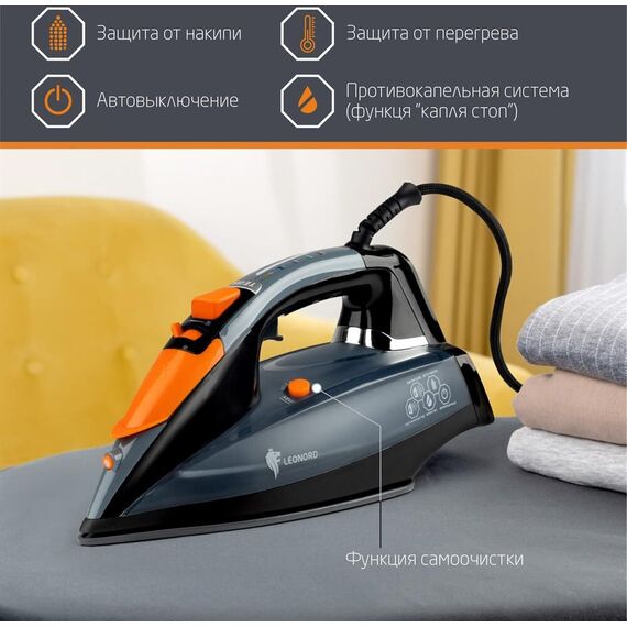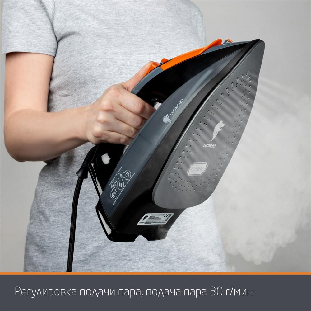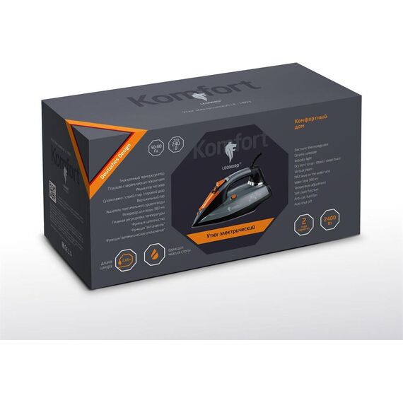 Электронное управление Мощность 2400Вт Подошва с керамическим покрытием Сухая глажка/спрей/пар/паровой удар/вертикальное отпаривание Индикатор нагрева Функция автоотключение Функция самоочистки Функця "капля стоп" Функция защиты от накипи Объем резервуара для воды 380 мл Паровой удар 0,5 г/удар Подача пара 20г/мин Регулировка подачи пара Шарнирное крепление шнура Длина сетевого шнура 1,7м Размер подошвы 23,1*12,1см Зауженный носик Мерный стакан в комплекте Защита от перегрева