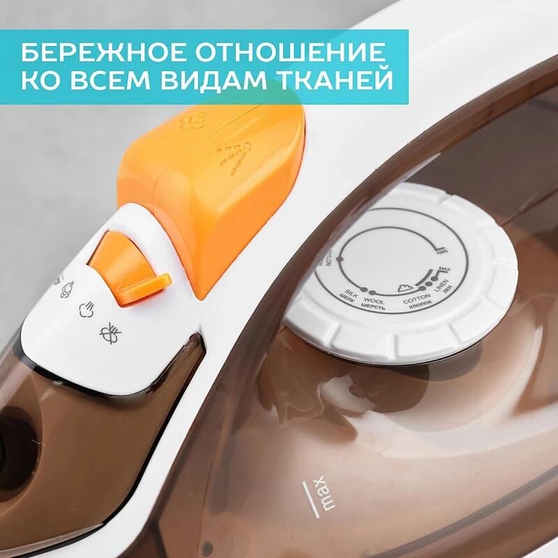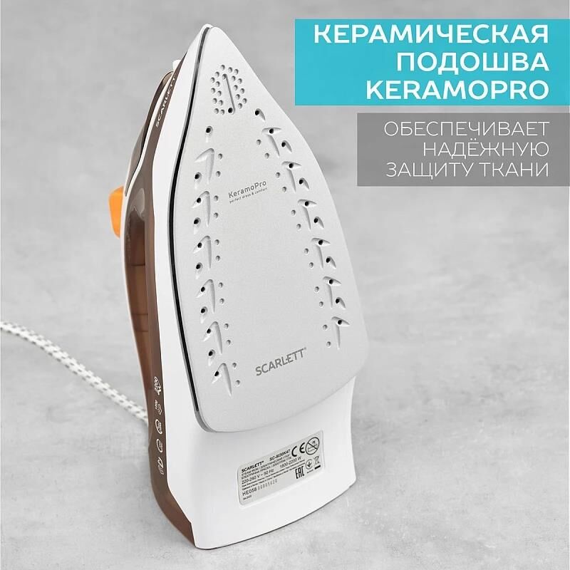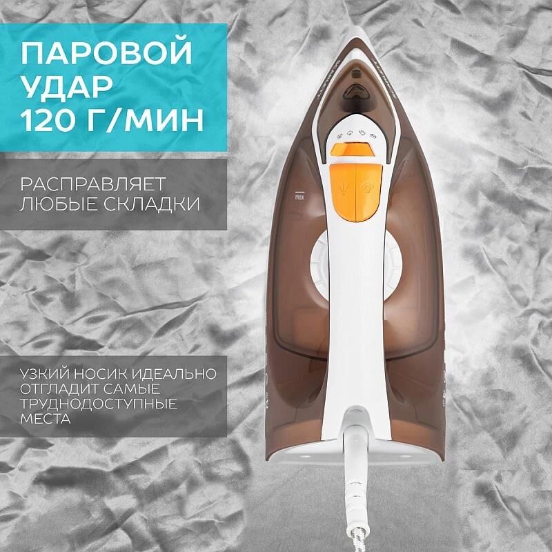 Мощность, Вт: 2200 Световой индикатор работы: Да Регулируемый пар до г/мин: 60 Паровой удар до г/мин: 120 Резервуар для воды, мл: 250 Функция разбрызгивания воды: Да Терморегулятор: Да Вертикальное отпаривание: Да Регулировка степени отпаривания: Да Покрытие подошвы: Керамическая подошва KeramoPro Самоочистка: Да Система защиты от накипи ANTI-CALC: Да Размер утюга Ш*В*Г, мм: 280*118*136 Шарнирное крепление шнура: Да Длина электрошнура, м: 1.6 Цвет: Коричневый Утюг Scarlett SC-SI30K47, выполненный в коричневом цвете, оснащён подошвой с керамическим покрытием KeramoPro, которая обеспечивает отличное скольжение и бережное отношение ко всем видам тканей. Максимальная мощность 2200 Вт позволит в считанные минуты справиться даже с тканями со сложной фактурой, а различные температурные режимы помогут выбрать оптимальный для того, чтобы самые деликатные ткани выглядели после глажения идеально. В режиме парового удара создает 120 грамм пара в минуту