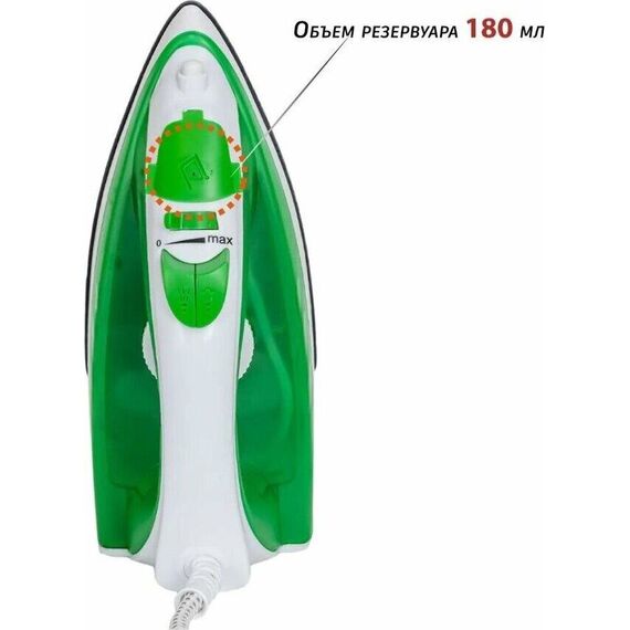 Тип устройства утюг паровой. Покрытие подошвы керамическое. Объем резервуара для воды, мл 180. Шаровое крепление сетевого кабеля есть. Постоянный пар, г/мин 14. Паровой удар, г/мин 80. Материал корпуса пластик. Цвет белый с зеленым. Энергопотребление. Потребляемая мощность, Вт. 1800. Электропитание, в., Гц. 220-240, 50-60.