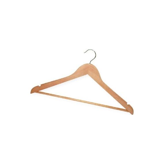 Классическая деревянная вешалка. Подходит для хранения как повседневной одежды, так и для тяжелых зимних вещей (пуховики, кожаные пальто и т.д.). Вращающийся крючок позволяют повесить вешалку под любым углом. По краям имеются углубления для бретелек и перекладина для брюк и юбок. Сделана из экологически-чистого сырья. Размеры: 44,5х23,5х1,2 см.