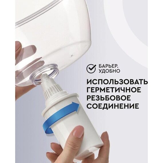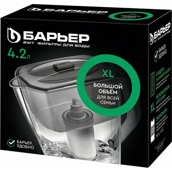 Объём кувшина 4,2 л, Размеры упаковки 280x140x260мм, Объём очищенной воды 2 л, Наличие и тип индикатора ресурса Механический, Объём воронки 1,7 л, Вес 0.96 кг, Большой объем, Чистая вода для всей семьи, Механический индикатор ресурса, Защита от попадания загрязнений в отфильтрованную воду, Конструкция воронки защищает от попадания пыли в отфильтрованную воду, Автоматически открывающаяся воронка, Воронка открывается при наклоне кувшина, Кувшин изготовлен из безопасных материалов, рекомендованных для контакта с питьевой водой, Особенность фильтров-кувшинов БАРЬЕР — надежное резьбовое крепление кассеты к воронке кувшина, что исключает попадание неочищенной воды из воронки в отфильтрованную воду.