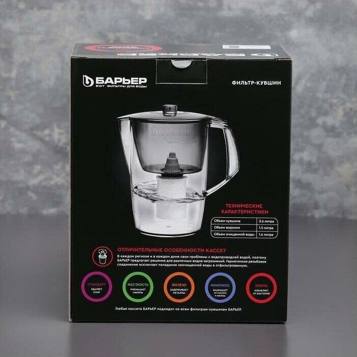 Классический кувшни для большой семьи, объем кувшина 3,6 литра, объем воронки 1,5 литра, классическая круглая форма, мерная шкала на корпусе, календарный индикатор замены кассеты, срок службы не более 5 лет, кассета в комплекте, ресурс кассеты 350 л.