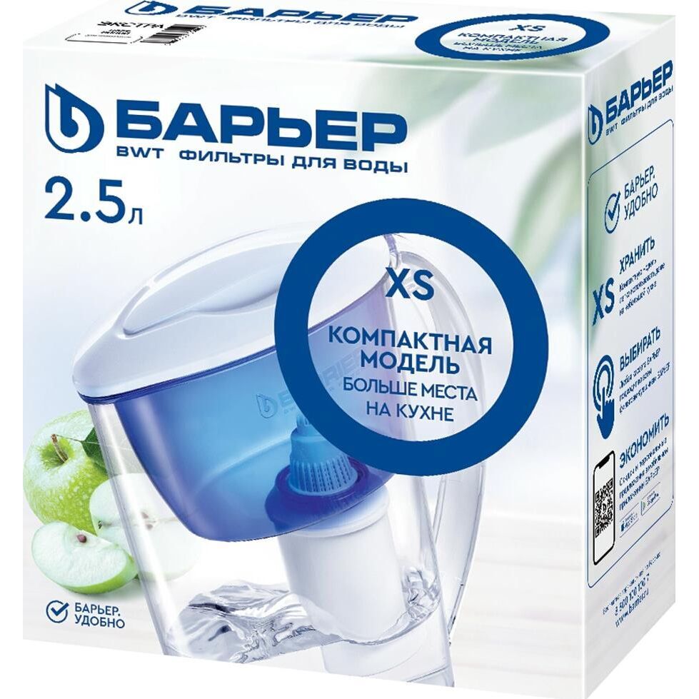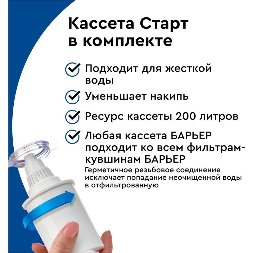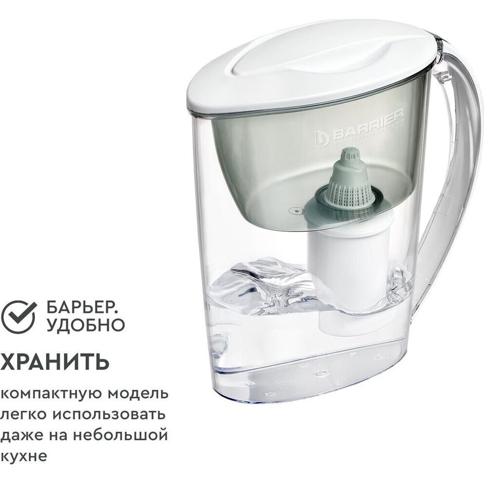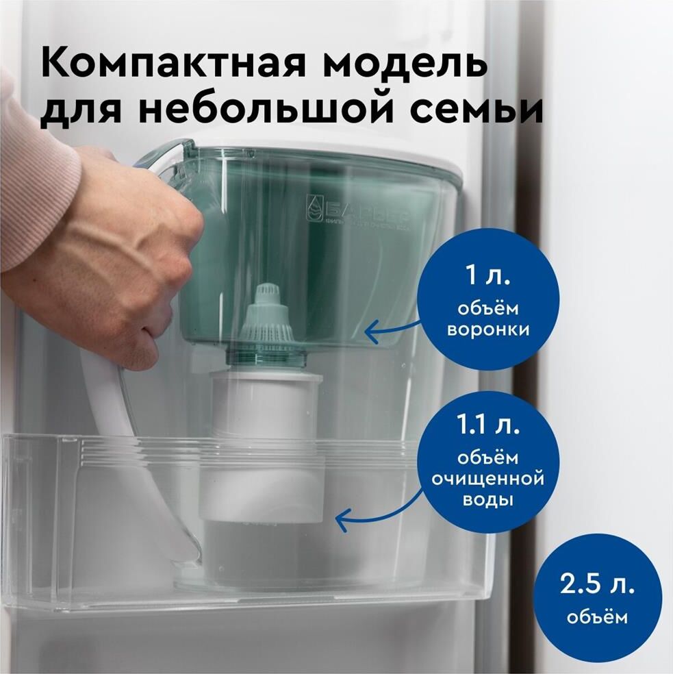 Узкий кувшин небольшого объема. За счет компактных размеров помещается в дверце холодильника. Конструкция крышки защищает воду от попадания пыли. Воронка автоматически откидывается при наклоне кувшина. Надежное резьбовое крепление не позволяет попасть неочищенной воде в отфильтрованную. В комплекте с кувшином кассета БАРЬЕР Старт с ресурсом 200 литров. Кассета умягчает воду, защитит от хлора, тяжелых металлов и других вредных примесей. Кувшин можно мыть в посудомоечной машине. Одна кассета БАРЬЕР способна заменить несколько сотен пластиковых бутылок. По окончании ресурса кассету можно сдать на переработку. Объем емкости 2.5 л В комплекте накопительная емкость Физические параметры Производительность 0.3 л/мин Ресурс фильтрующего модуля 350 л Размеры ШхГхВ: 17х20х25 см Дополнительно Дополнительная информация объем отфильтрованной воды: 1.1 л; объем воронки: 1 л