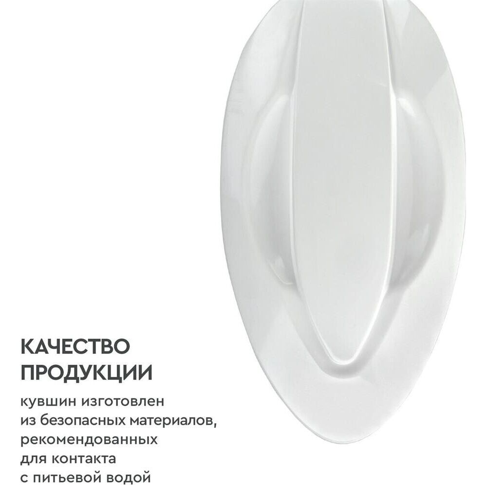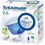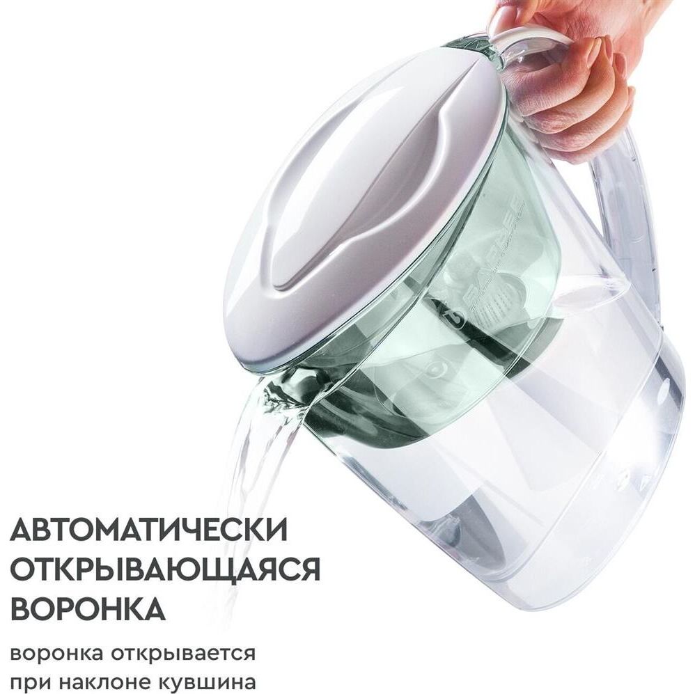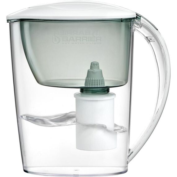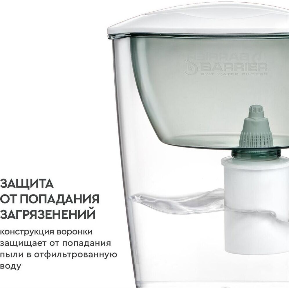 Узкий кувшин небольшого объема. За счет компактных размеров помещается в дверце холодильника. Конструкция крышки защищает воду от попадания пыли. Воронка автоматически откидывается при наклоне кувшина. Надежное резьбовое крепление не позволяет попасть неочищенной воде в отфильтрованную. В комплекте с кувшином кассета БАРЬЕР Старт с ресурсом 200 литров. Кассета умягчает воду, защитит от хлора, тяжелых металлов и других вредных примесей. Кувшин можно мыть в посудомоечной машине. Одна кассета БАРЬЕР способна заменить несколько сотен пластиковых бутылок. По окончании ресурса кассету можно сдать на переработку. Объем емкости 2.5 л В комплекте накопительная емкость Физические параметры Производительность 0.3 л/мин Ресурс фильтрующего модуля 350 л Размеры ШхГхВ: 17х20х25 см Дополнительно Дополнительная информация объем отфильтрованной воды: 1.1 л; объем воронки: 1 л