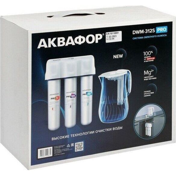 Система DWM-312S PRO — высокопроизводительный обратный осмос в небольшом корпусе. Абсолютное умягчение воды и максимальная степень удаления растворенных примесей, а также вирусов, бактерий и цист без химических бактерицидов. Давление в водопроводе не менее 1,5 атм. Давление в водопроводе не более 6,5 атм. Вода холодная. Масса 5,0 кг. Накопительная емкость внешняя кувшинного типа. Оптимизирует минеральный состав. Защита от бактерий. Сразу несколько инноваций позволили увеличить ресурс глубокой очистки сорбционного картриджа PRO 1. Он защищает мембрану от хлора и грубых примесей, чтобы продлить ресурс её тонкой очистки. Модуль справляется с мутной водой и с повышенным содержанием железа, включая Fe2+ и Fe3+.