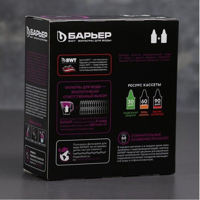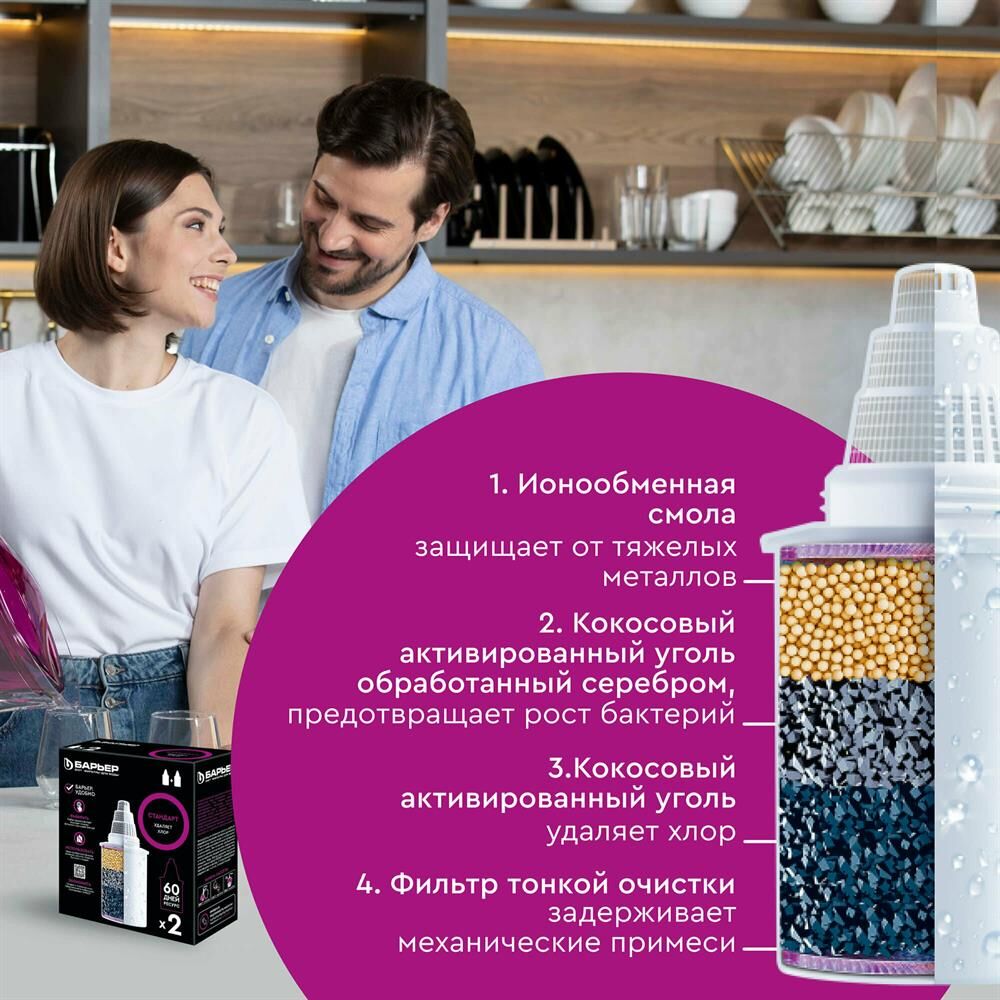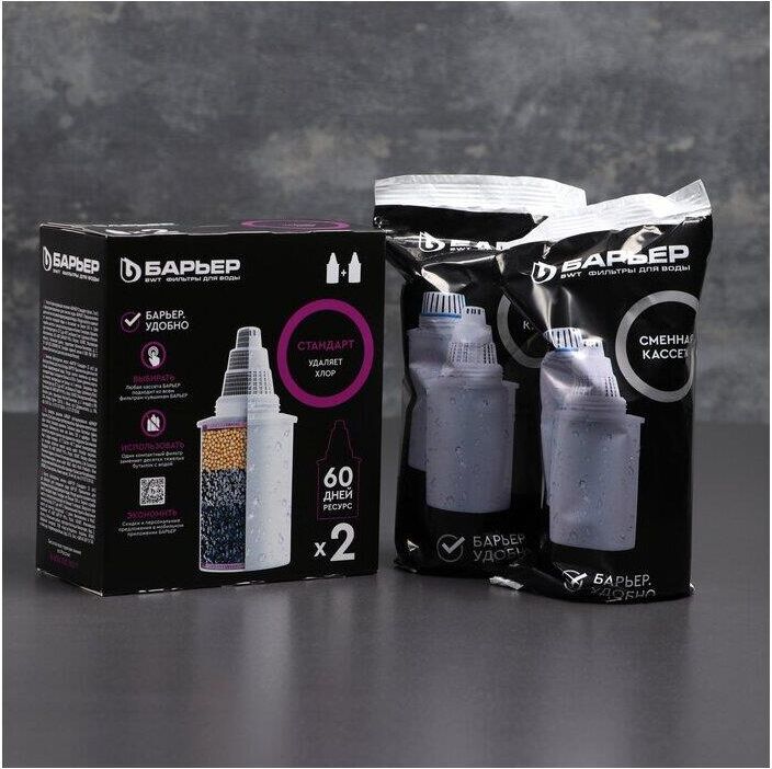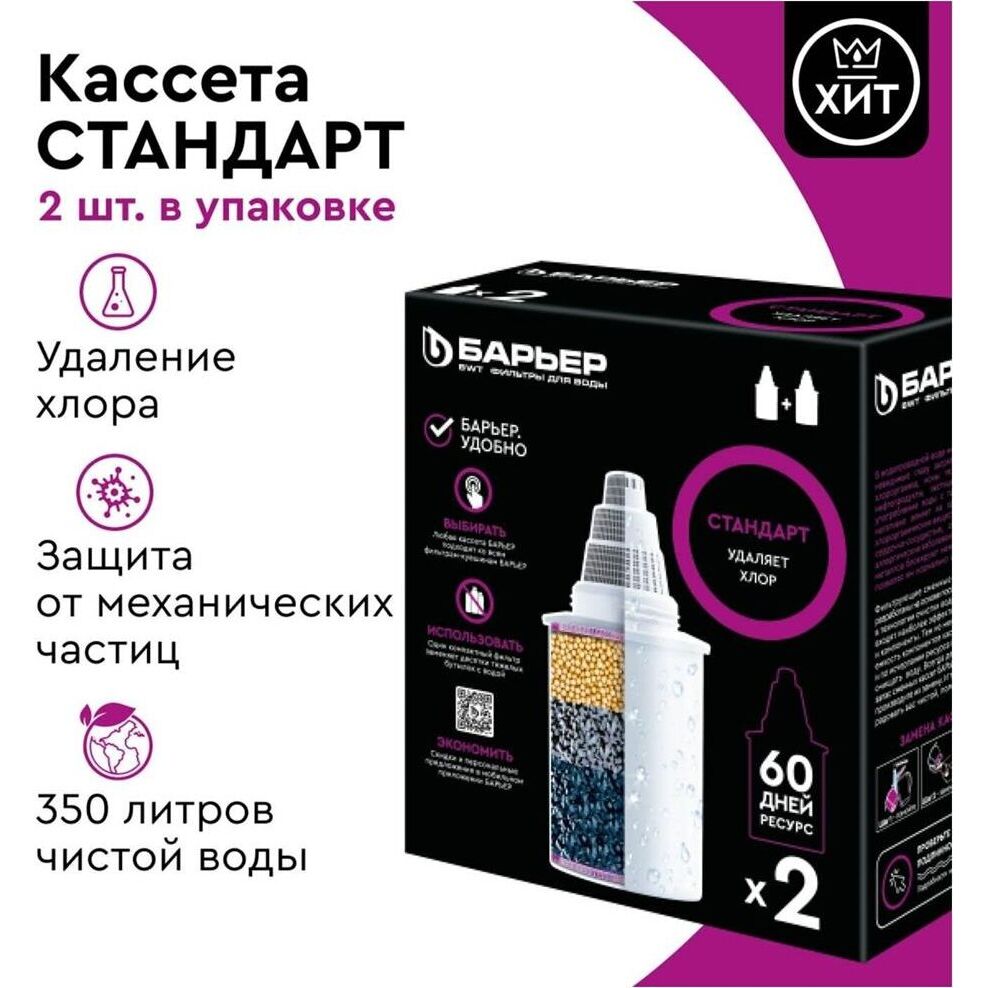 Кассета Барьер Стандарт экономичная упаковка, 2 шт в коробк, устраняет хлор, свинец, ртуть, ржавчина, песок, другие твердые частицы, побочные продукты хлорирования, ресурс кассеты составляет 350 литров, кассета подходит ко всем кувшинам Барьер.