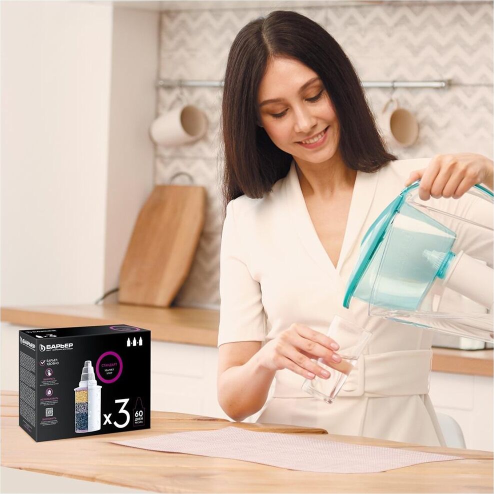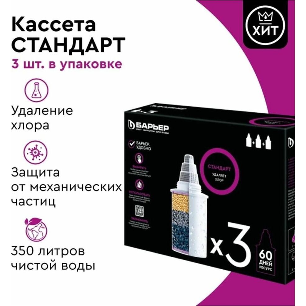 Кассета «Барьер Стандарт» Выгодная покупка х 3 шт в коробке. Устраняет: хлор, свинец, ртуть, ржавчина, песок, другие твердые частицы, побочные продукты хлорирования. Ресурс кассеты составляет 350 литров. Кассета «БАРЬЕР Стандарт» подходит ко всем фильтрам-кувшинам БАРЬЕР.