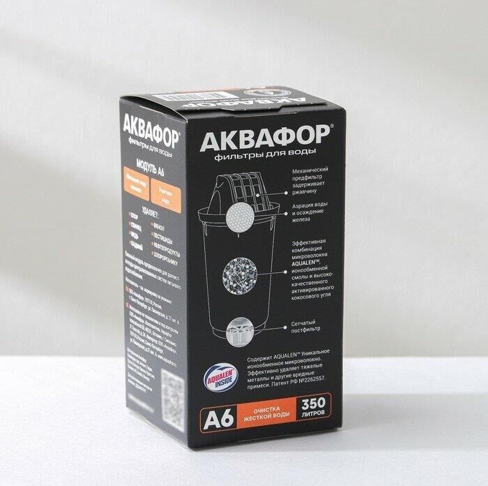 АКВАФОР А6 Модуль сменный фильтрующий (по 12 шт. в трансп. упаковке) Уменьшает образование накипи, увеличенный обьем сорбента продлевает ресурс до 350л воды. Обогащение очищенной воды магнием до 30% дневной нормы. Защта от хлора, тяжелых металлов, ржавчины, органических соединений, фенола.