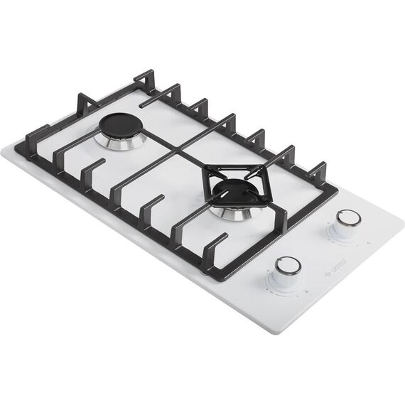Габаритные размеры ШхГхВ: 30х53х9,5 см * Цвет: белый * Эмалированная варочная поверхность * Двухгорелочный стол * Газ-контроль горелок стола * чугунные решетки горелок стола * две средние горелки * фиксированное положение «малое пламя» * электророзжиг горелок, встроенный в ручки *