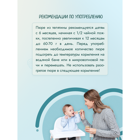 Рекомендации по употреблению: детям с 6 месяцев, начиная с 1/2 чайной ложки, постепенно увеличивая к 12 месяцам до 60-70 грамм в день. Перед употреблением необходимое количество пюре подогреть до температуры кормления на водяной бане или в микроволновой печи и перемешать.