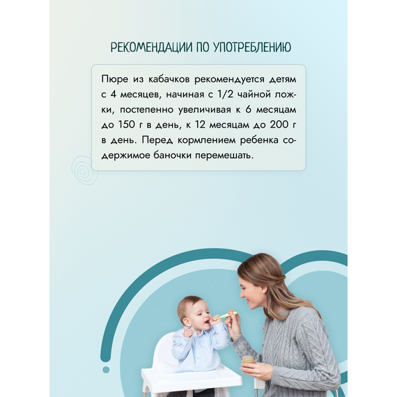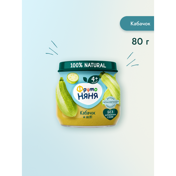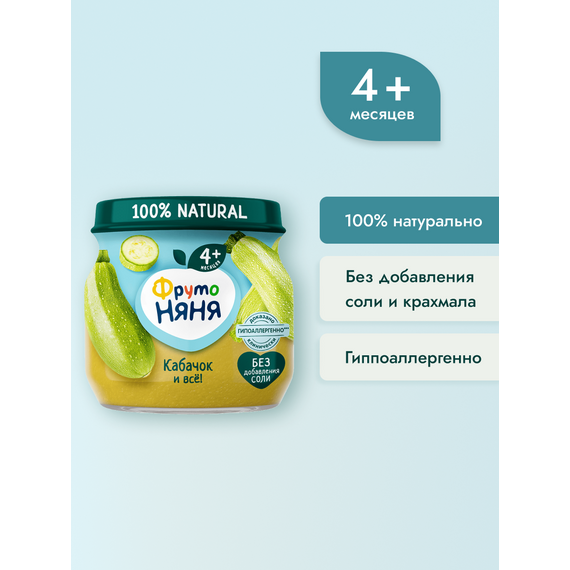 Овощное пюре ФрутоНяня «Кабачок» идеально подходит для малышей уже с 4 месяцев, которые только начинают знакомство с первым прикормом. Это детское питание имеет полностью натуральный состав: только овощи, которые мы отбираем с особым вниманием, и питьевая вода. Кабачковое пюре ФрутоНяня откроет малышу новый натуральный вкус без консервантов, красителей и соли, а мамам даст уверенность в выборе первого прикорма! Гипоаллергенность доказана клинически.