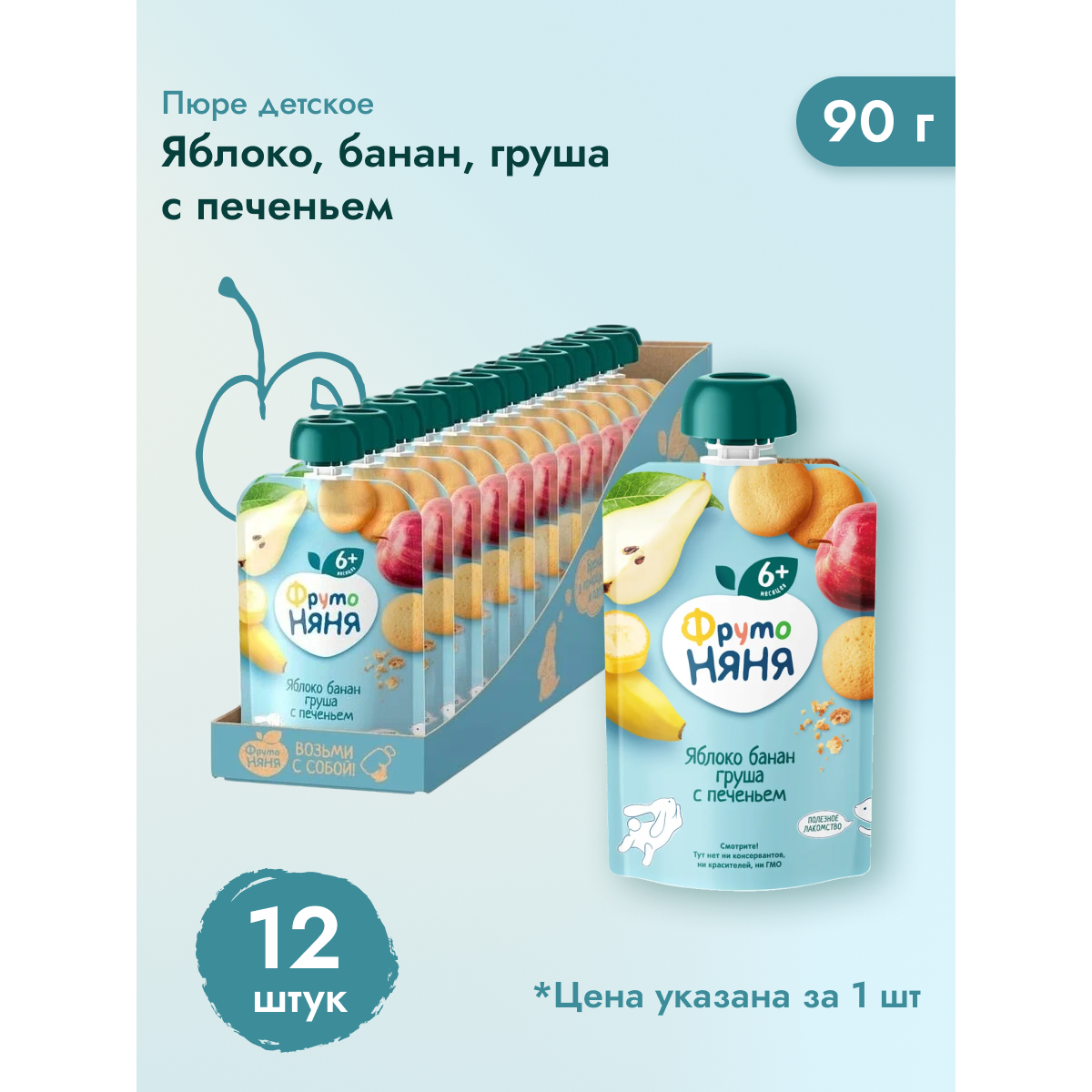 ФрутоНяня Пюре из яблок, бананов и груш с печеньем, 90 г
