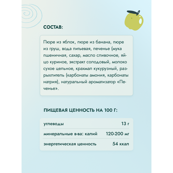 Пюре из яблок, пюре из банана, пюре из груш, вода питьевая, печенье (мука пшеничная, сахар, масло сливочное , яйцо куриное, экстракт солодовый, молоко сухое цельное, крахмал кукурузный, разрыхлитель (карбонаты амония, карбонаты натрия), натуральный аромат