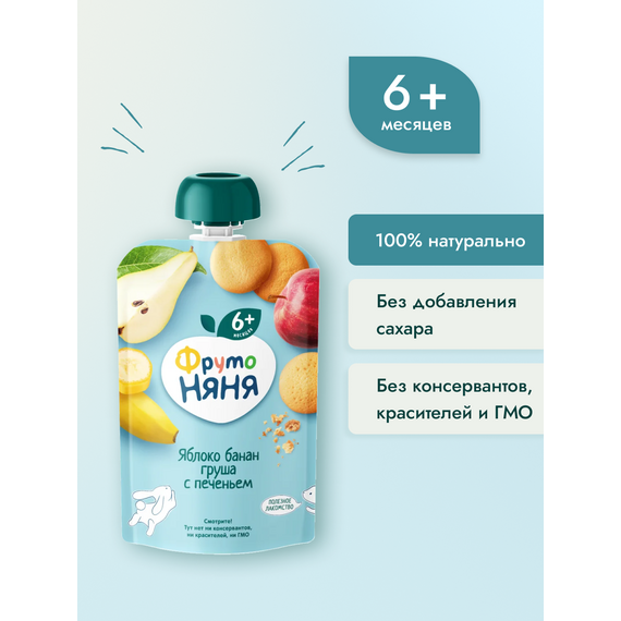 Фруктовое пюре «ФрутоНяня» из яблок, бананов и груш с печеньем в мягкой упаковке — это вкусный и полезный перекус, который удобно брать с собой, а яркая мягкая упаковка привлечет внимание вашего малыша и позволит ему есть самостоятельно. Нежные бананы, спелые груши, отборные яблоки и специальное детское печенье обеспечат организм вашего малыша природной пользой и энергией для гармоничного роста!