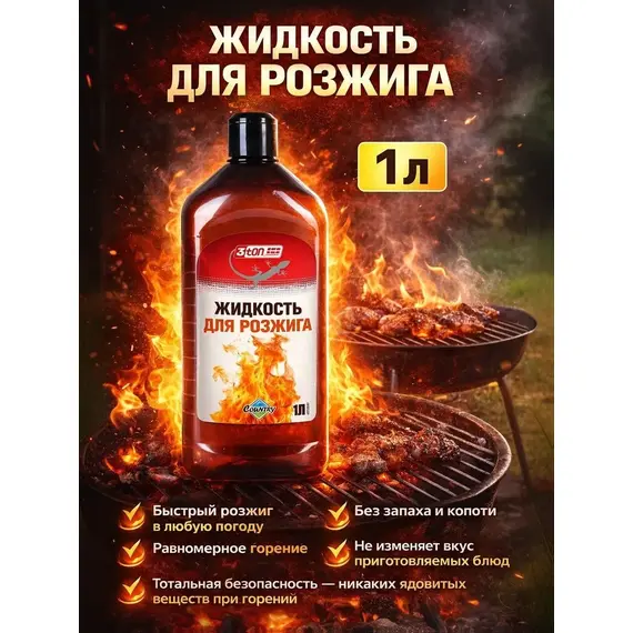 Жидкость для быстрого розжига древесного угля, дров и топливных брикетов на основе фракций жидких парафинов. Практически не имеет запаха и не изменяет вкус приготовляемых продуктов. При попадании на продукты питания не оказывает вредного воздействия.