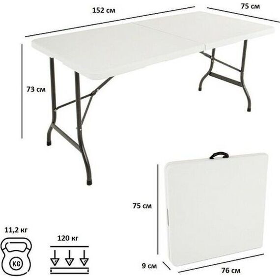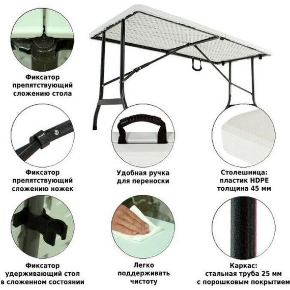 Стол раскладной, выполнен из качественного пластика, каркас - сталь. Складывается в одно движение. В сложенном состоянии очень компактный. В дождь, на зиму или пока вас нет на даче можно убрать. Стол подойдет как для дачи или сада, так и для помещения. Не боится влаги. Есть возможность фиксации ножек. • Размер - 183х74х74см •толщина 5 см •Вес брутто/нетто 15,5/14,5 кг. • Размер коробки: 92*76,5*9 см •Материал пластик+ металл.