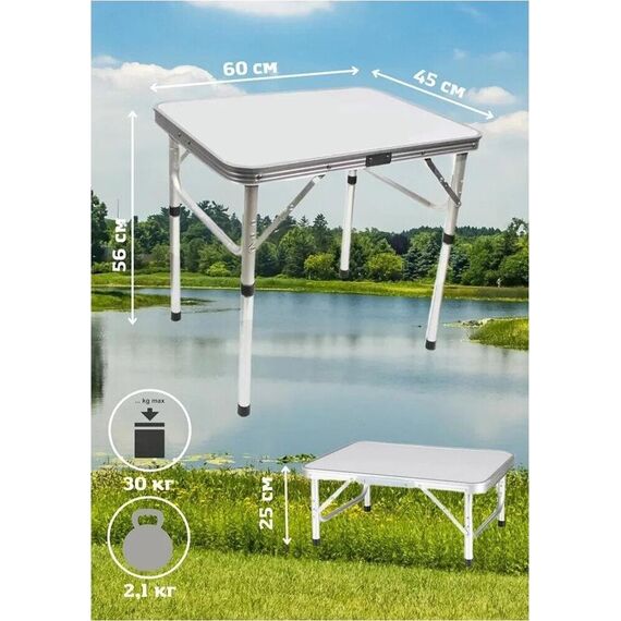 Размеры: 60*45*56 см материал: алюминий, столешница МДФ, пластмасса Диаметр трубки 25*0,7 мм Вес без упаковки: 2.1 кг.