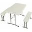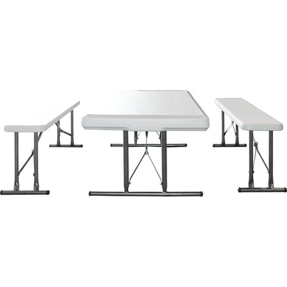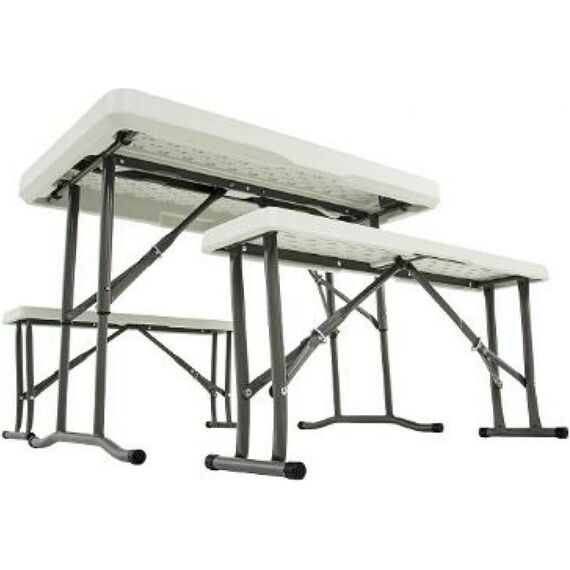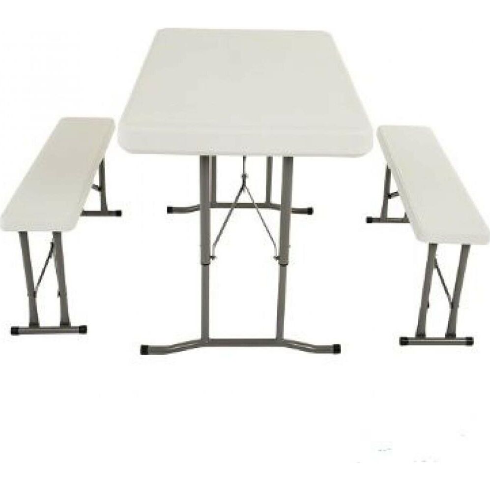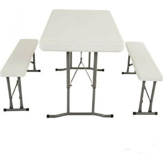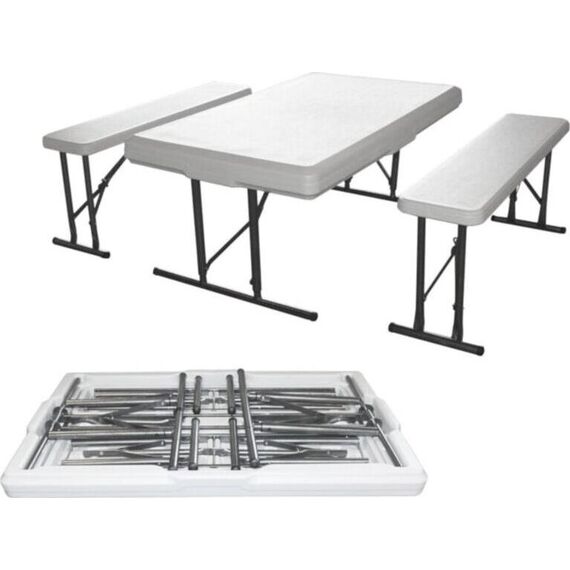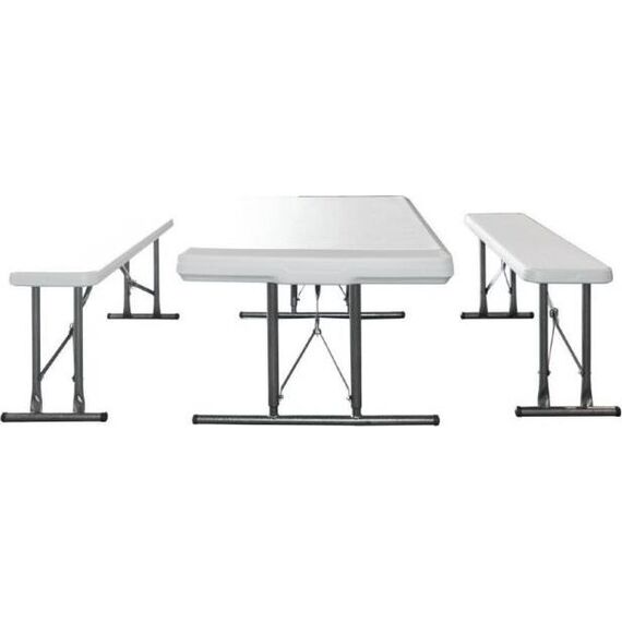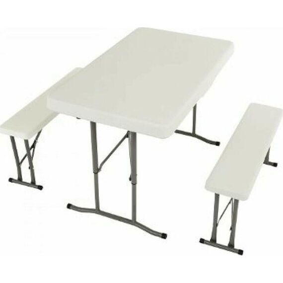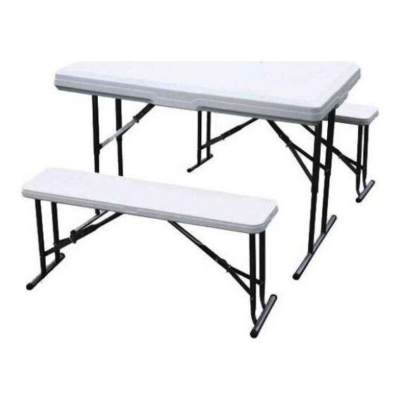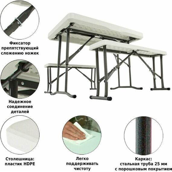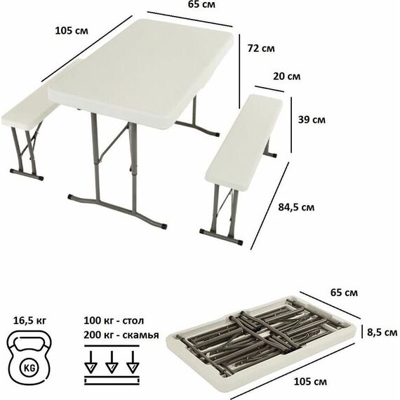 Удобный и компактный набор складной мебели просто незаменим для отдыха на природе, скамейки убираются внутрь стола, удобная ручка для переноски. • Размер - 113х68х72,5 см • Вес брутто/нетто 18,5/17 кг. •Толщина набора- 9 см • Размер скамейки 95х23х42 см •Толщина скамеек 4,2 см •Материал пластик+ металл