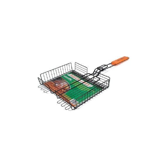 GREEN GLADE 7003 Двойная решетка-гриль – это удобное приспособления для приготовления вкусных блюд из мяса, рыбы, овощей на свежем воздухе с помощью углей. Решетка имеет удобную деревянную ручку, а благодаря компактности и небольшому весу, ее всегда можно взять с собой на пикник. • Вес нетто: 0,98 кг • Размер: 67х41х31 см • Длина ручки: 36 см • Материал: углеродистая сталь • Толщина: 4,5 мм (ручка); 3,0 мм (основной каркас); 1,8 мм (внутренняя обрешетка) • Покрытие: хромированное • Ручка: деревянная