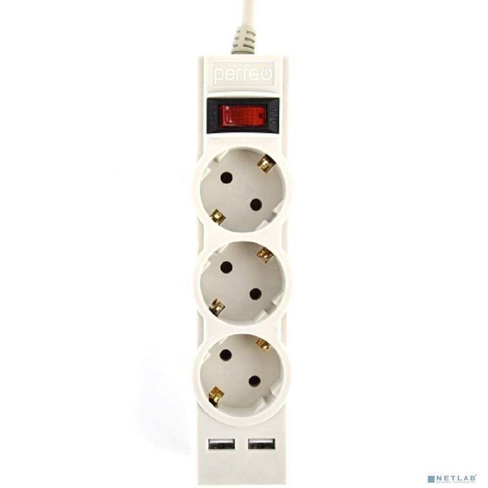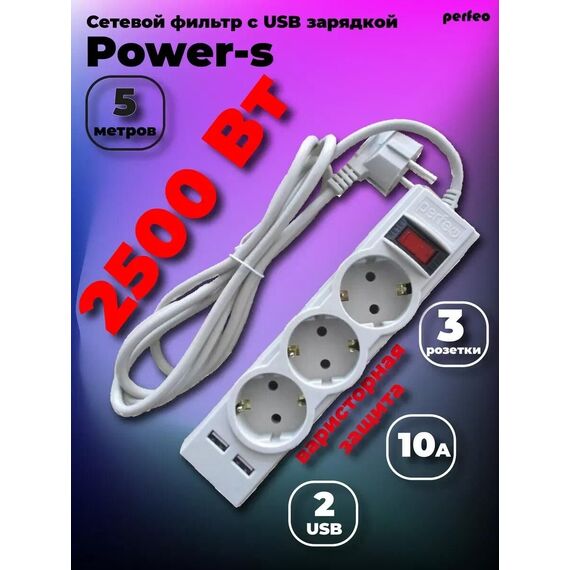 Сетевой фильтр PERFEO (PF_E1642) "POWER-S", 5,0м, 3 розетки 10А, 2USB, 2500 Вт, двойная защита, серый