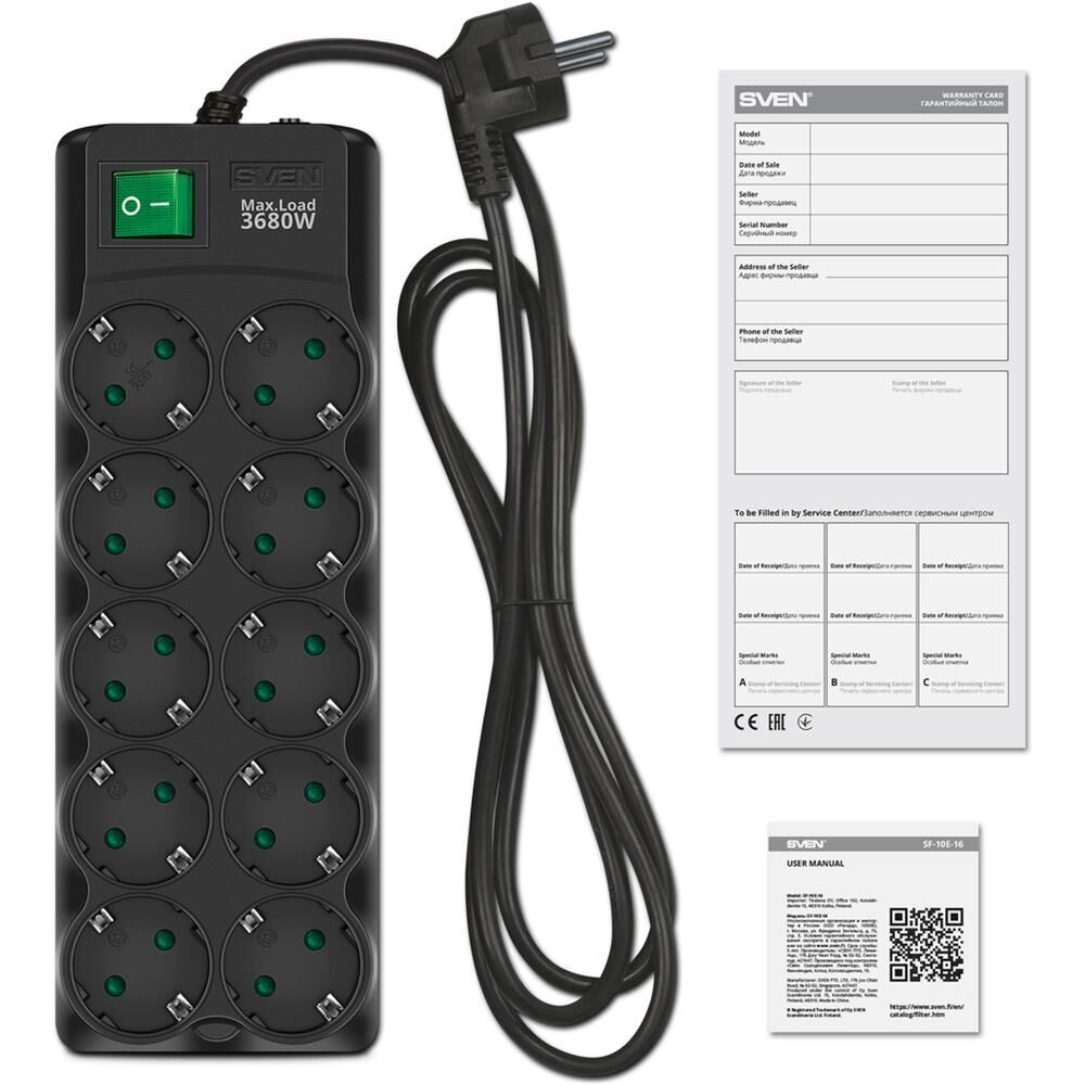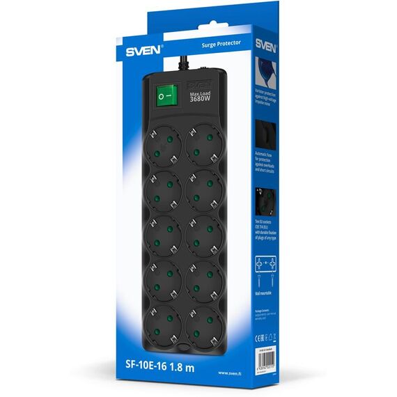 Сетевой фильтр SVEN SF-10E-16 1,8 м (10 розеток) черный
