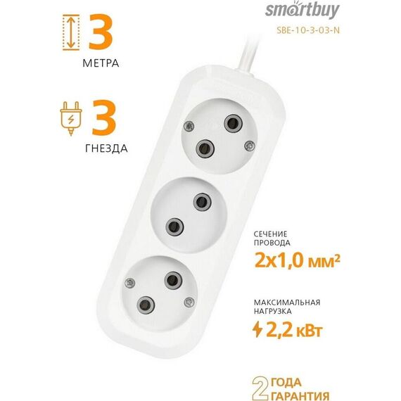 Удлинитель без заземления SMARTBUY (SBE-10-3-03-N) 3 гнз х 3,0 м (10А/2.2кВт, ПВС 2х1.0)