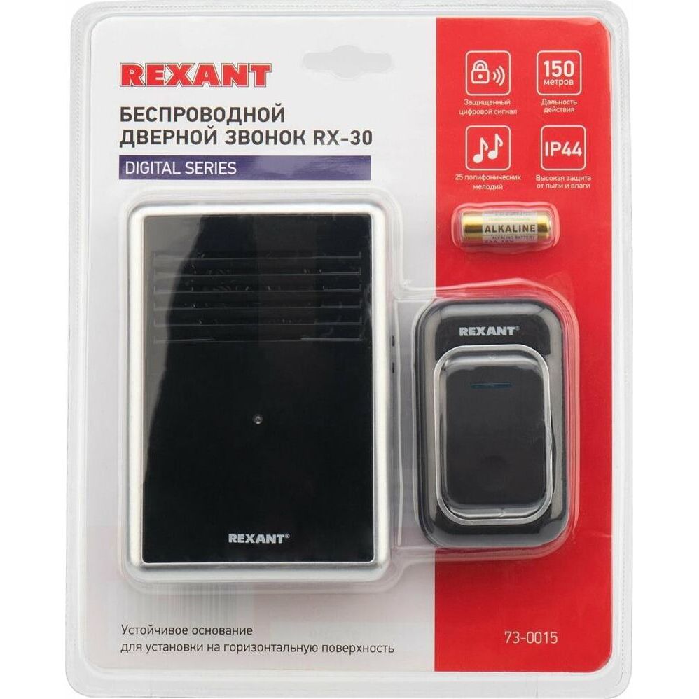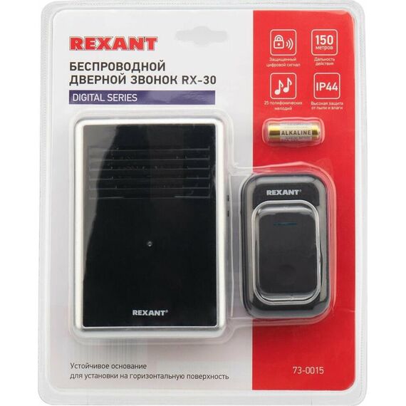 Звонки дверные REXANT (73-0015) RX-30 ЗВОНОК БЕСПРОВОДНОЙ C ЦИФРОВЫМ КОДИРОВАНИЕМ, ВЛАГОЗАЩИЩЕННОЙ КНОПКОЙ IP44 И РЕГУЛИРОВКОЙ ГРОМКОСТИ