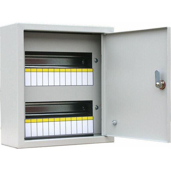 Щит распределительный навесной, 330х300х120мм, замок, 2 ключа, оцинкованная DIN-рейка, оцинкованная лента для крепления шин N и PE, оцинкованная панель для крепления счётчика, пломбировочная коробка вводного автомата, знаки электробезопасности.