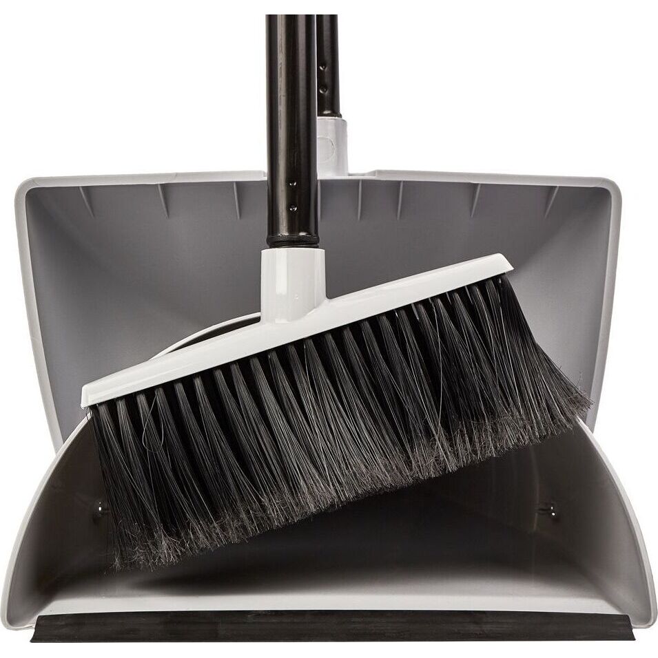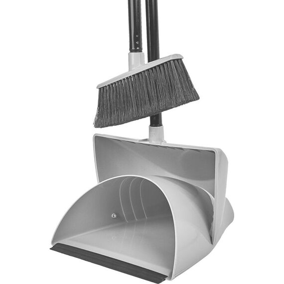 Набор для уборки коллекция Vogue, большой совок, с крышкой, серебряный, с длинными ручками, 135х275х1260 Мягкая кромка совка Spin&Clean плотно прилегает к полу, не давая проскальзывать пылинкам под него. Высокие края совка Spin&Clean Vogue препятствуют разлетанию собранного мусора. При переноске совка, закрывается крышка, мусор не видно и он не разлетается. Совок из прочного долговечного пластика можно использовать как в помещении, так и на улице. Щетка с длинной ручкой Spin&Clean Vogue с плотной набивкой притягивает пыль и мусор, удерживая пыль среди ворсинок, оставляя поверхность пола абсолютно чистой. Щетка расположена под небольшим углом к креплению ручки, что позволяет без труда заметать пыль под мебелью. Щетка и совок устойчивы к бытовой химии и горячей воде. Щетка удобно закрепляется на ручке совка Spin&Clean Voguel и компактно хранится в вертикальном положении или с совком на крючке.