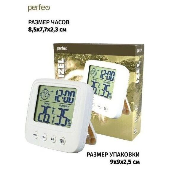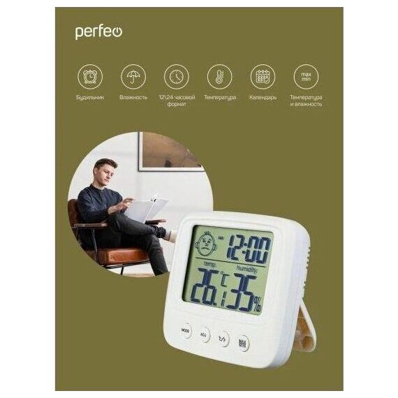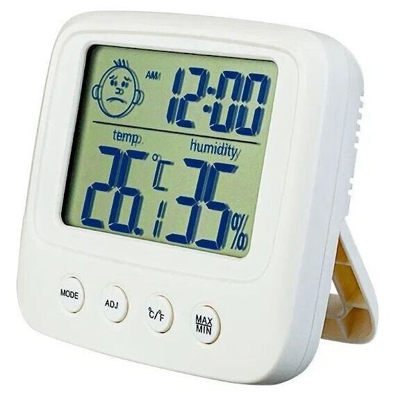 ОСНОВНЫЕ ХАРАКТЕРИСТИКИ:; • Цифровой дисплей с одновременным; отображением времени, температуры; и влажности внутри помещения; • Отображение времени: час, минута,; 12/24 часа переключаемый; • Функция будильника; • Отображение температуры: С/F; • Отображение max и