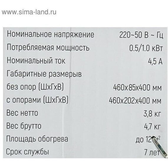 Механическое управление -Защита от перегрева -Надежный терморегулятор -Два режима нагрева -Длина кабеля 1.5 метра -Класс электрозащиты I -Степень защищенности от пыли/влаги IP24 -Нагревательный элемент Х-монолит -Простота монтажа (настенная/напольная установка) -Опоры в комплекте -Ударопрочный корпус -Привлекательный индивидуальный дизайн. Размеры прибора (ШхГхВ), мм 460х107х400 ГАРАНТИЯ 3 года.