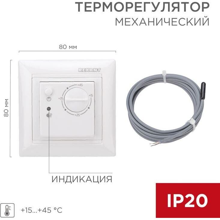 Механический термостат RX-308B от REXANT белого цвета обеспечивает регулировку температуры в диапазоне от +15°C до +45°C. Имеет высокую коммутационную способность контактов до 16 А (3500 Вт), что позволяет использовать его для управления большим количеством электроприборов. Одним из преимуществ механического термостата является наличие внешнего датчика температуры с сопротивлением 10 кОм. Это позволяет точнее контролировать температуру в помещении и обеспечить комфортную атмосферу. Термостат RX-308B подходит для использования в различных областях, включая домашнее и офисное применение. Легко устанавливается и прост в использовании. Терморегулятор совместим с электроустановочными средствами Legrand серии Valena.