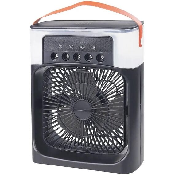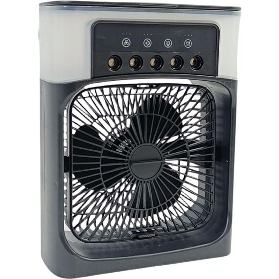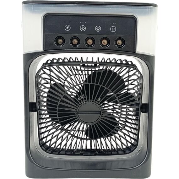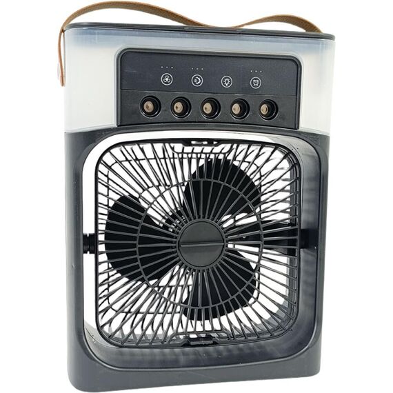 Настольный вентилятор с функцией увлажнителя и таймером выключения Диаметр: 15 см Мощность: 10 Вт 3 скорости Объём: 600 мл 3 режима распыления воды 7 цветов подсветки Встроенный таймер Отсек для аромамасел USB(Туре-С) Цвет ЧЕРНЫЙ Размер упаковки: 34,5*22*38см Сеть: 5В,2А