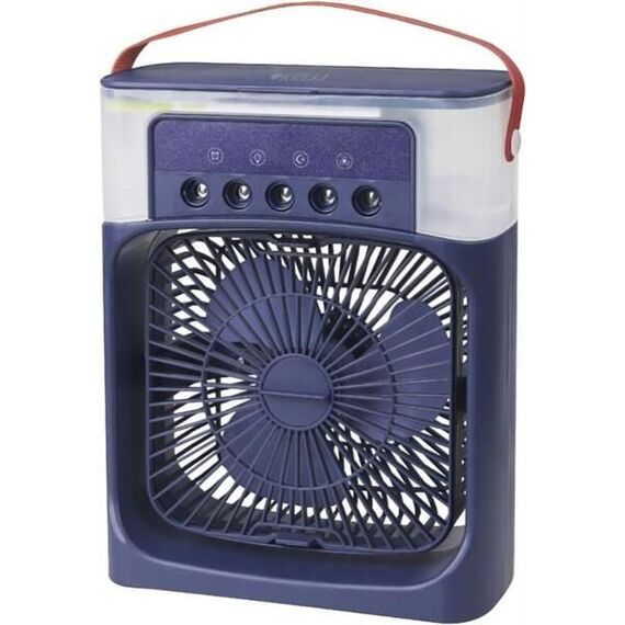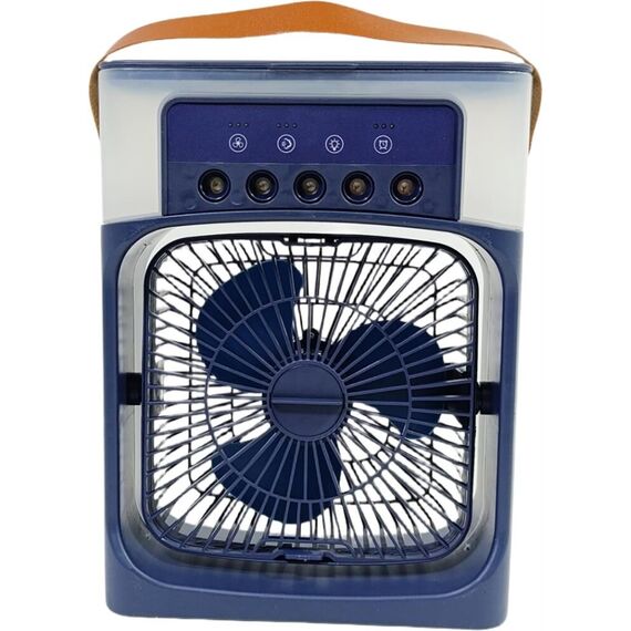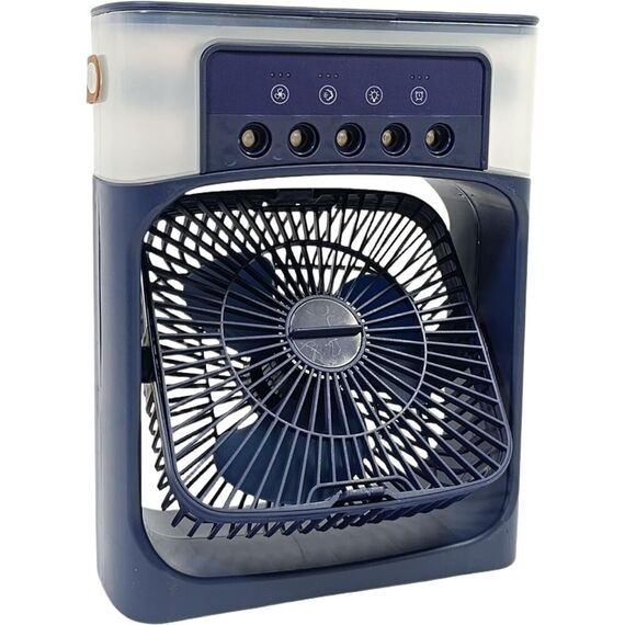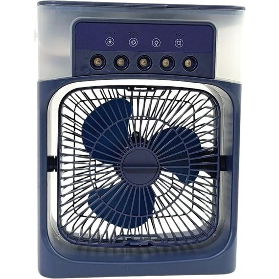 Настольный вентилятор с функцией увлажнителя и таймером выключения Диаметр: 15 см Мощность: 10 Вт 3 скорости Объём: 600 мл 3 режима распыления воды 7 цветов подсветки Встроенный таймер Отсек для аромамасел USB(Туре-С) Цвет СИНИЙ Размер упаковки: 34,5*22*38см Сеть: 5В,2А