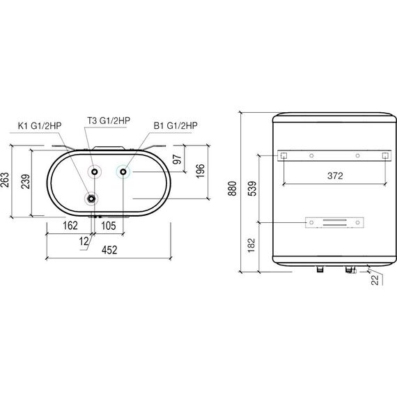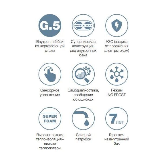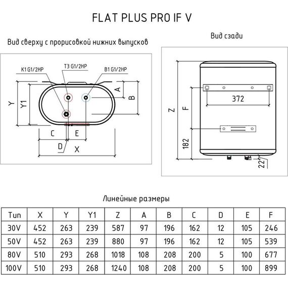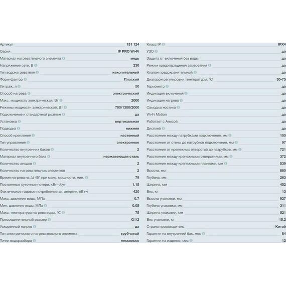 Материал нагревательного элемента медь Напряжение сети, В 230 Тип водонагревателя накопительный Форм-фактор Плоский Литраж, л 50 Способ нагрева электрический Макс. мощность электрическая, Вт 2000 Режимы мощности электрической, Вт 700/1300/2000 Установка вертикальная Подводка нижняя Способ крепления настенный Тип управления электронное Количество внутренних баков 2 Материал внутреннего бака нержавеющая сталь Сухой ТЭН нет Количество анодов 2 Количество нагревательных элементов2 Время нагрева на ∆t 45° при макс. мощности, мин. 79 Макс. давление воды, МПа0.7 Мин. давление воды, МПа 0.05 Макс. температура нагрева воды, °С 75 Присоединительный размер G1/2 Ускоренный нагрев да Класс IP IPX4 УЗО да Защита от включения без водыда Режим предотвращения замерзания да Клапан предохранительный да Диапазон регулировки температуры, °С30-75 Термометр да Индикация включения да Индикация нагрева да Самодиагностика да Дисплей да Высота, мм880 Глубина, мм263 Ширина, мм452 Вес, кг13