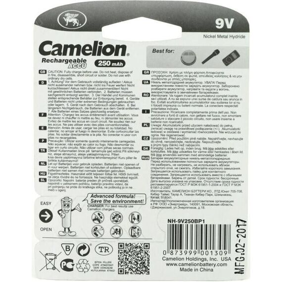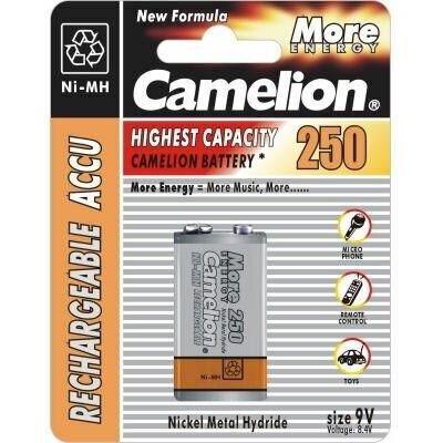 Аккумулятор Camelion NH-9V250BP1, напряжение 9В, емкость 250мА*ч, кол-во в упаковке 1 шт., размер упаковки 90x117x18 мм, использовать при температуре от - 20 до + 40 °C