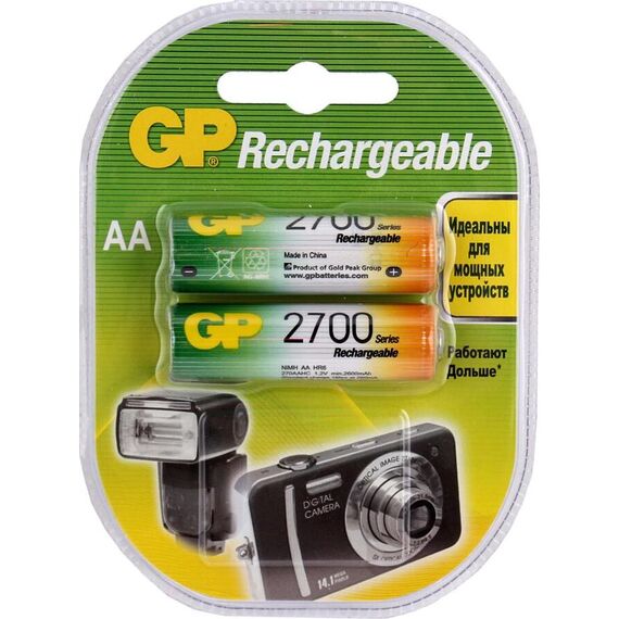 Никель-металлогидридные аккумуляторы отличаются большим сроком службы и демонстрируют стабильную работу в широком диапазоне температур, а главное – выдерживают до 500 циклов перезарядки. Перезаряжаемые аккумуляторы GP отлично подходят к любым энергоемким портативным устройствам: игровым мини-консолям, фонарикам, плеерам, пультам дистанционного управления, часам, компьютерным мышам и клавиатурам, фотоаппаратам и т. д. Типоразмер аккумуляторов: АА. Длина: 50,5 мм. Диаметр: 14,5 мм. Масса: 31 гр. Емкость аккумуляторов: 2700 мАч. Напряжение: 1,2 В. Температура эксплуатации: от –20°С до +50°С. Срок годности: 3 года. Количество аккумуляторов в упаковке: 2 шт.