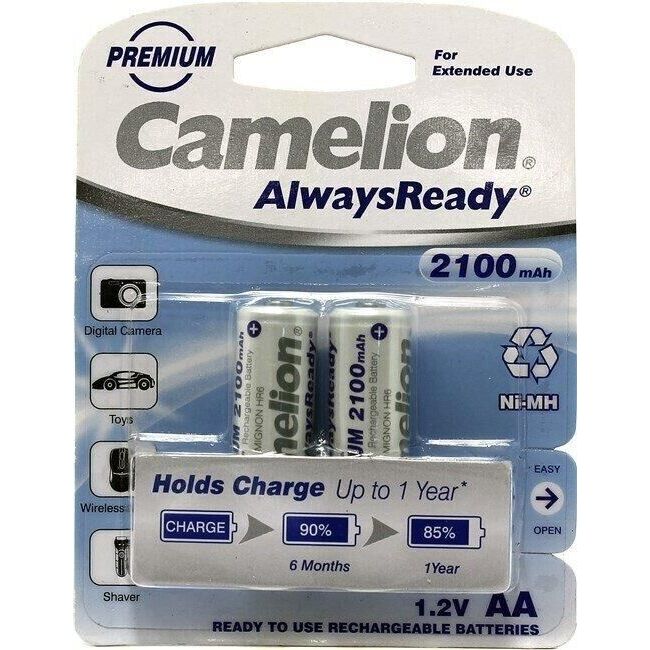 Аккумулятор Camelion NH-AA2100ARBP2, напряжение 1,2В, емкость 2100мА*ч, кол-во в упаковке 2 шт., размер упаковки 90x115x11 мм, использовать при температуре от - 20 до + 40 °C