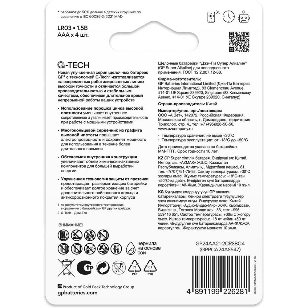 Алкалиновые батарейки GP Super Alkaline G-Tech 24А ААA - 4 шт. на блистере