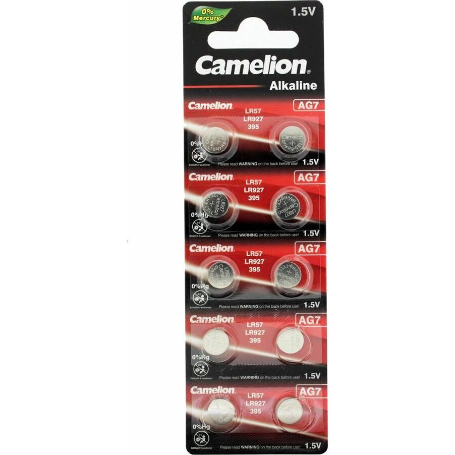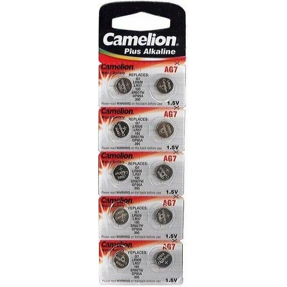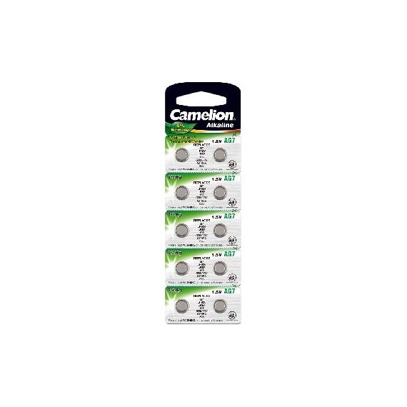 Батарейка алкалиновая Camelion G 7 BL-10 Mercury Free (AG7-BP10(0%Hg), 395A/LR927/195 батарейка для часов), напряжение 1,5В, емкость 34мА*ч, кол-во в упаковке 10 шт., размер упаковки 50x160x5 мм, использовать при температуре от -18 до +55 °C, хранить при температуре от + 15 до + 25 °C. Срок хранения 5 лет.