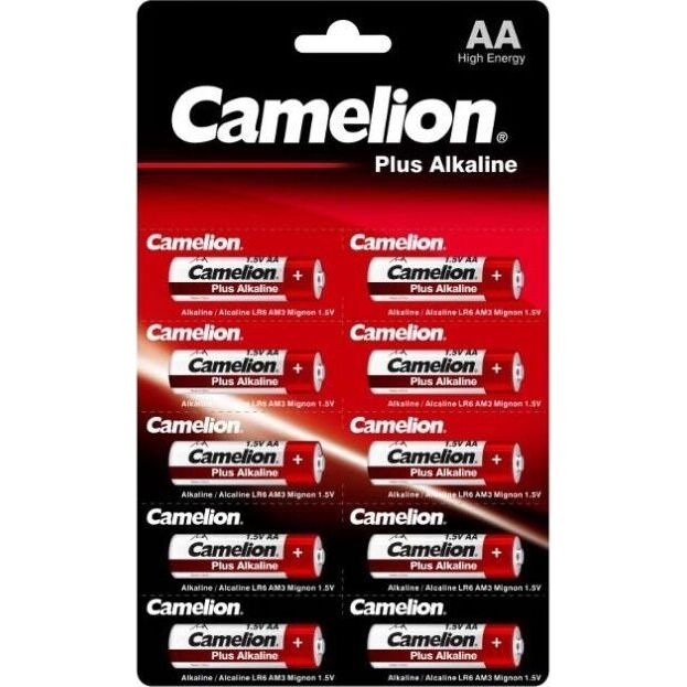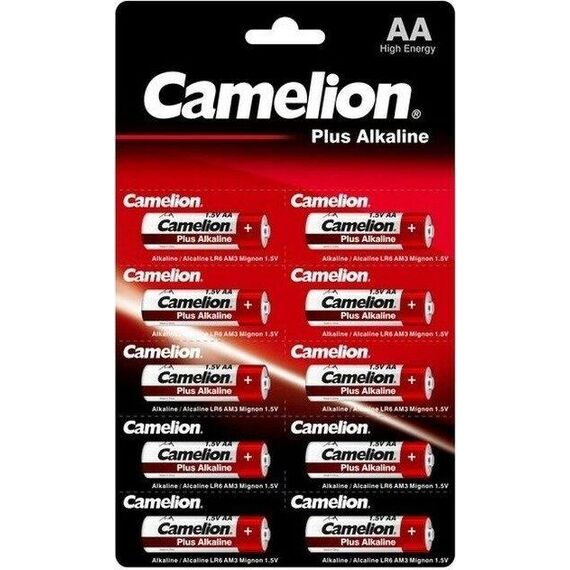 Батарейка алкалиновая Camelion LR6-BP1x10P, напряжение 1,5В, емкость 2700мА*ч, кол-во в упаковке 10 шт., размер упаковки 135x225x16 мм, использовать при температуре от -18 до + 55 °C, хранить в сухом помещении при температуре от +15 до +25°C. Срок хранения 10 лет.