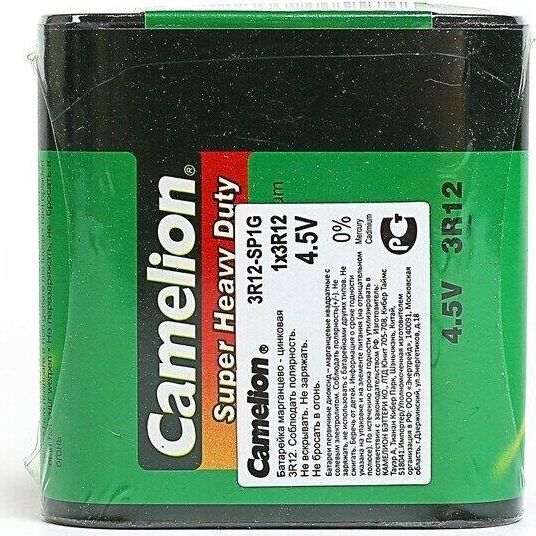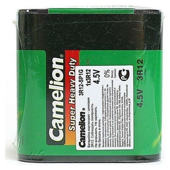 Батарейка солевая Camelion 3R12-SP1G, напряжение 4,5В, емкость 2000мА*ч, кол-во в упаковке 1 шт., размер упаковки 62x65,5x22 мм, использовать при температуре от -18 до + 55 °C, хранить в сухом помещении при температуре от +15 до +25°C. Срок хранения 3 года.