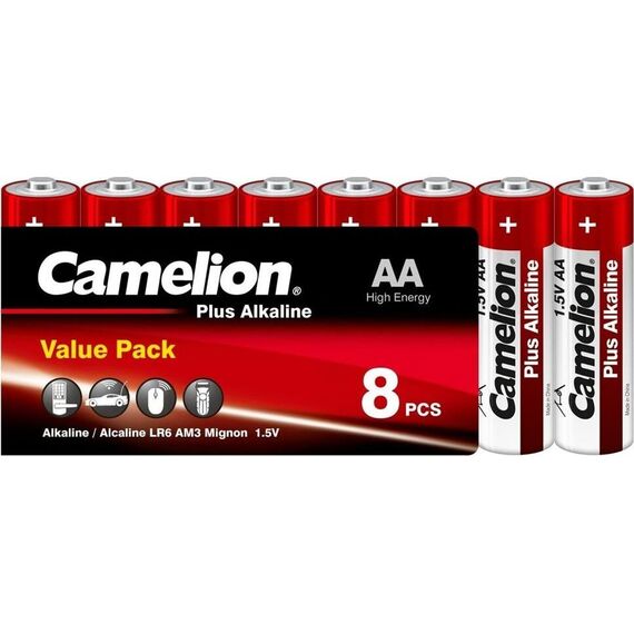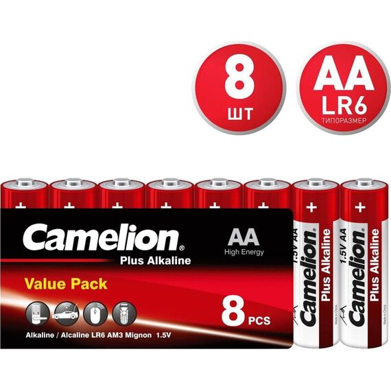 Батарейка алкалиновая Camelion LR6-SP8, напряжение 1,5В, емкость 2700мА*ч, кол-во в упаковке 8 шт., размер упаковки 110x50x14 мм, использовать при температуре от -18 до + 55 °C, хранить в сухом помещении при температуре от +15 до +25°C. Срок хранения 10 лет.