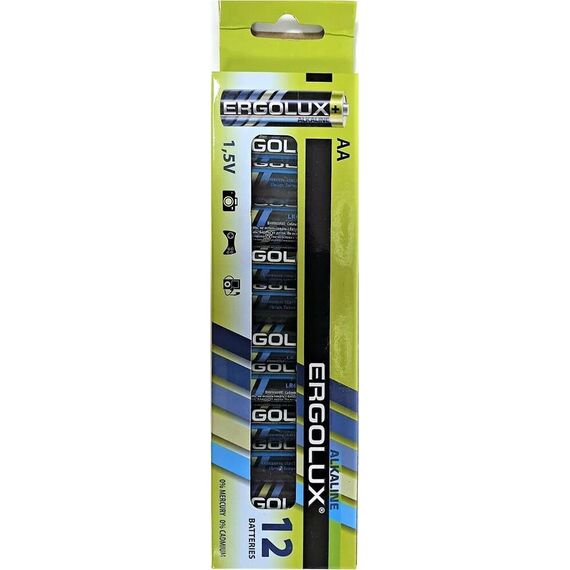 Батарейка Ergolux Alkaline BP-12 (AA - LR6, 1.5В), напряжение 1,5В, емкость 2700 мА*ч, кол-во в упаковке 12 шт., размер упаковки 50x170x15 мм, использовать при температуре от -10 до + 40 °C