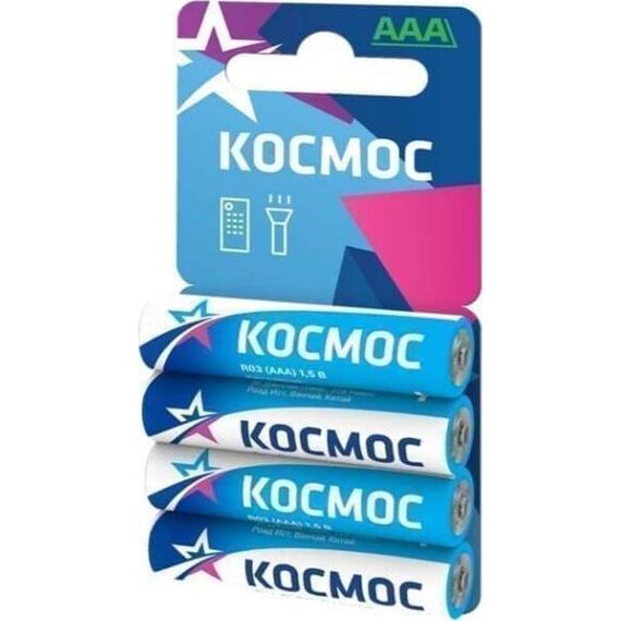 Элемент питания R03 4хBL (блист.4шт) Космос KOCR034BL представляет собой цилиндрическую цинково-угольную батарейку высотой 44,5 мм, типоразмера ААА. Поставляется в блистере, по 4 шт.